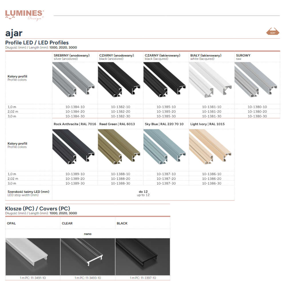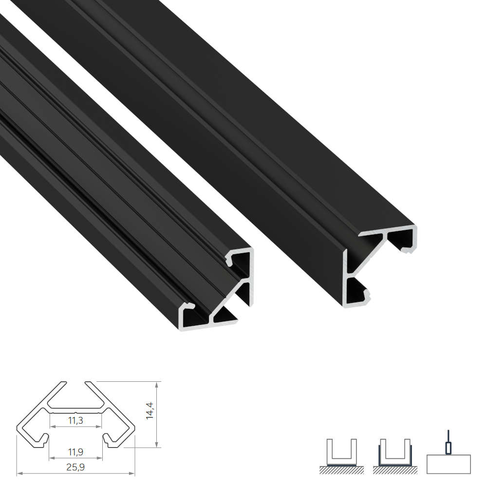 Ъглов алуминиев профил за LED лента Lumines Lighting 10-1382-30 Type Ajar в черен цвят, с дължина 3 м. Подходящ за повърхностен или окачен монтаж. Осигурява равномерно разпределение на светлината и ефективно охлаждане. Идеален за ъгли, ниши, тавани и декоративно осветление.