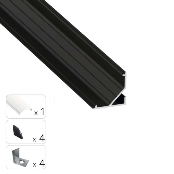 Ъглов алуминиев профил за LED ленти Lumines Lighting TEKKNI 38-0681-30, 3 м, черен, за повърхностен монтаж. Позволява фиксиране чрез лепене, винтове или монтажни клипсове. Ъгловият дизайн осигурява оптимално насочване на светлината за шкафове, рафтове и кухненски плотове. Комплектът включва 3 м профил, 3 м мат дифузер frozen, 4 черни крайни тапи и 4 монтажни скоби. Осигурява добро охлаждане и равномерна линейна светлина.