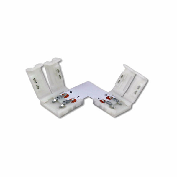 Ъглов конектор за едноцветна LED лента LVT-2368. Конекторът е двупинов, подходящ за свързване на две едноцветни ленти с широчина 10 мм без запояване. Размери 30x30x5 мм.