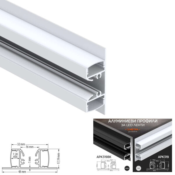 Алуминиев профил Ultralux APK319 за LED ленти с двоен светлинен ефект нагоре и надолу, подходящ за модерно интериорно осветление.