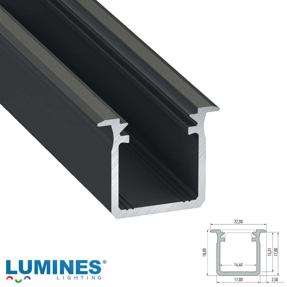 Луксозен мебелен профил за вграждане в черен цвят, за лед ленти и модули с широчина до 14 мм, без тапи и дифузер (с поръчка)