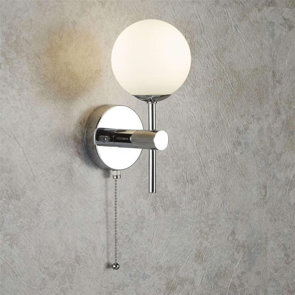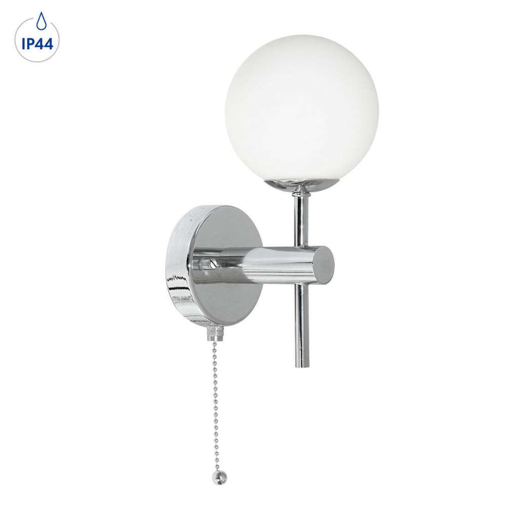Стенна лампа за баня с ключ, IP44, фасунга Е14, метал и стъкло опал, цвят хром