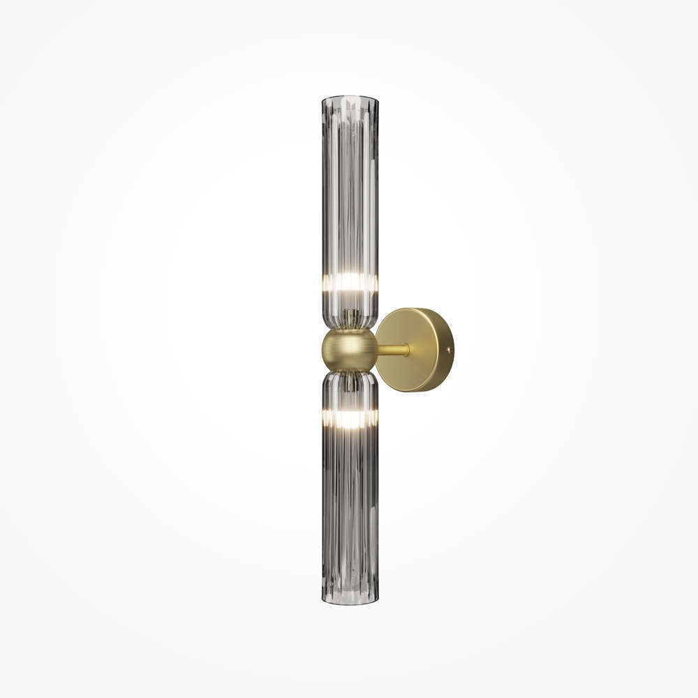Лампа за стена Maytoni Antic MOD302WL-02GR1 с два опушени сиви стъклени абажура, фасунги 2xG9, златиста метална конкструкция с кръгла розетка за стена и сферичен декоративен елемент между абажурите.