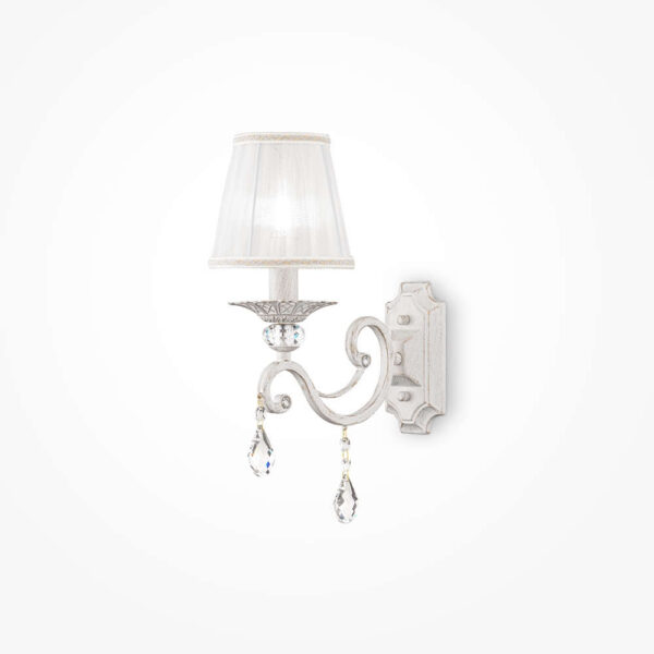 Компактен стенен аплик Maytoni Grace ARM247-01-G с абажур от органза и кристални висулки, предназначен за локално и допълващо осветление в класически интериор.