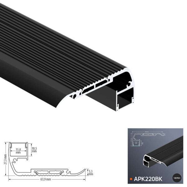 Стълбищен алуминиев профил за LED ленти Ultralux APK220BK, предназначен за монтаж на стъпала, съчетаващ безопасност, функционалност и модерен дизайн в черно.