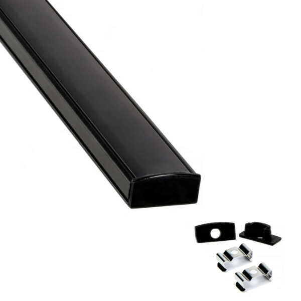 Слим профил за повърхностен монтаж 2 метра, черен, с черен дифузер, тапи и монтажни скоби