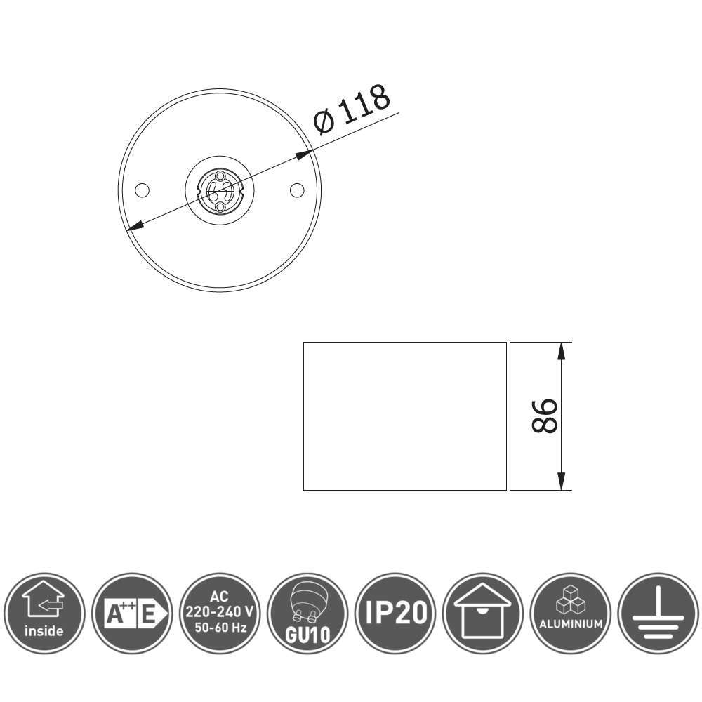 GTV SAKURA OS-SAKES111-10 е цилиндрична карданна луна за външен монтаж на таван съвместима с LED лунички AR111 с максимална мощност 20W. Луната е оборудвана с фасунга GU10 и е с размери Ø118x86 мм. Доставя се като празно тяло без лампа в комплекта. Изработена от алуминий в елегантен бял цвят, GTV SAKURA OS-SAKES111-10 придава модерен вид на всяко помещение с изчистения си дизайн. Осветителното тяло е подходящо за интериорно осветление в дома, офиса, магазини, хотели и всякакви обществени сгради.