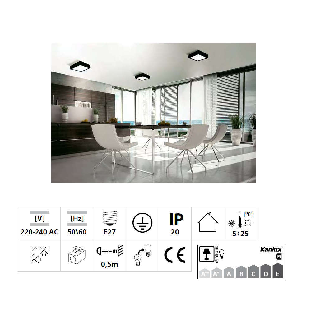 Kanlux Mersa 29050 е квадратен дървен плафон с елегантен изчистен дизайн, подходящ за директен монтаж на таван или стена в домашни и офис помещения. Осветителното тяло е адаптирано за две LED или енергоспестяващи крушки с основа E27 с максимална мощност по 60W всяка. Плафонът е изработен от дърво и сатинирано стъкло и осигурява равномерно разпръскване на светлината. Класическата комбинация от дърво в матиран черен цвят и стъкло го прави елегантно и очарователно решение за общо осветление. Плафонът е с размери 305х305 мм и височина 80 мм. Не е влагозащитен и не може да се използва при наличие на влага.