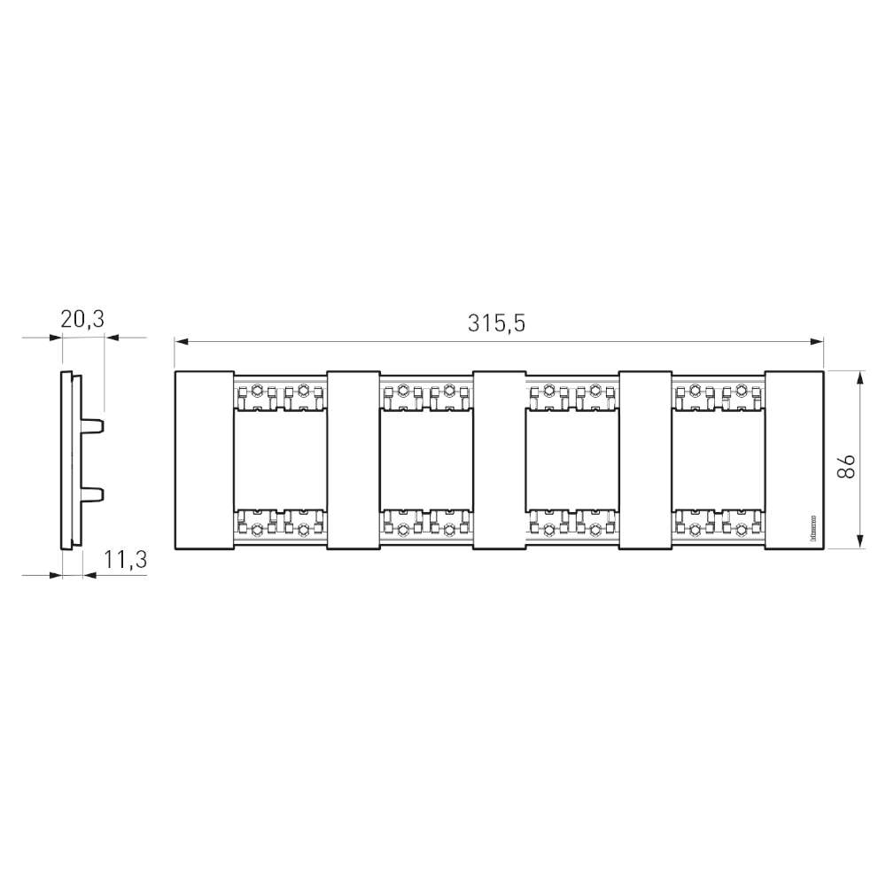 Четворната рамка е предназначена за монтаж по немски стандарт, при който всеки механизъм се монтира в отделна конзола с диаметър Ø71 мм, което позволява ясно структуриране на инсталацията и гъвкаво разположение на отделните функции.