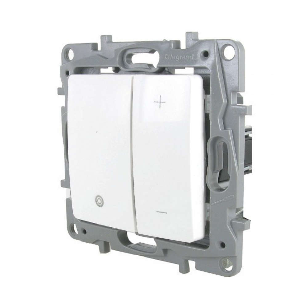 Димер за LED осветление Legrand 665114- бутонен димер подходящ да димира LED лунички и LED крушки с работно напрежение 220V. Висок клас бутонен димер Legrand с два бутона за управление. Подходящ за вграждане в стенна конзола със стандартни размери. Напълно окомплектован с рамка и фиксиращи скоби димер за светодиодно осветление с гаранция 24 месеца.