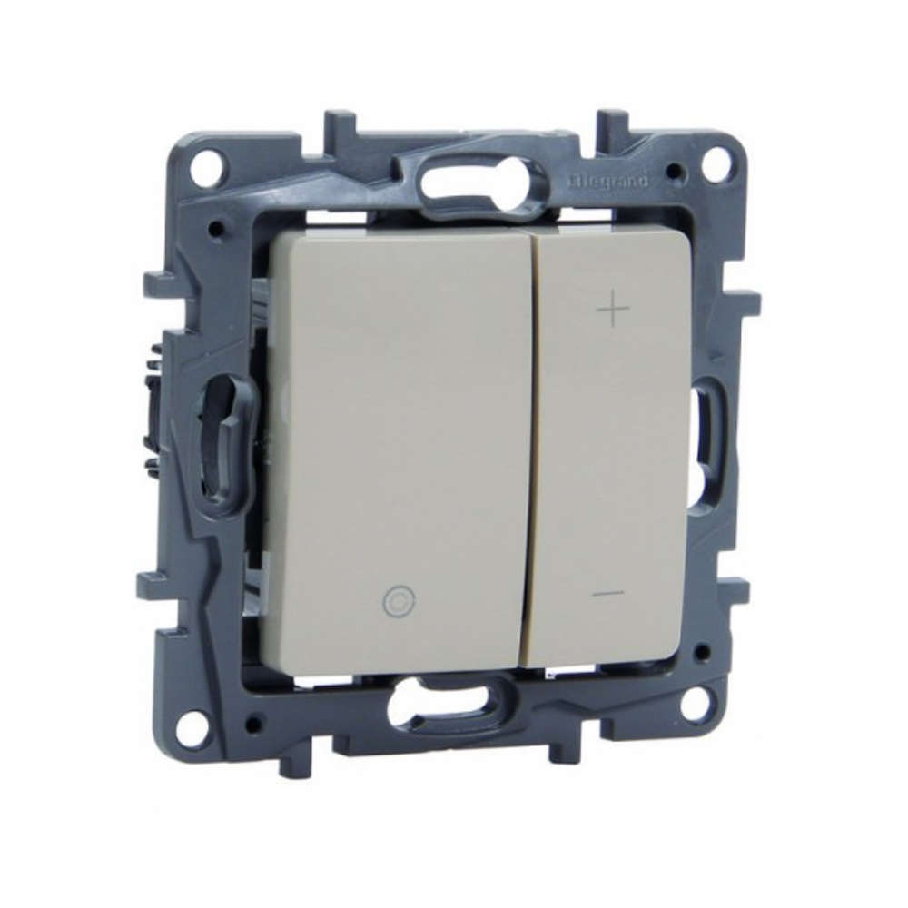 Димер за led осветление - бутонен димер подходящ да димира led лунички и led крушки с работно напрежение 220V. Висок клас бутонен димер Legrand с два бутона за управление. Подходящ за вграждане в стенна конзола със стандартни размери. Напълно окомплектован с рамка и фиксиращи скоби димер за светодиодно осветление с гаранция 24 месеца.