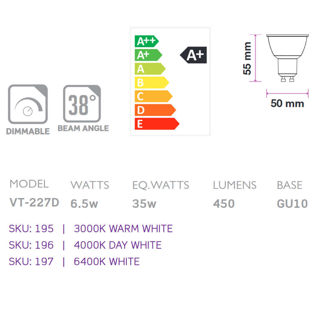 Димируеми LED лунички V-TAC 195 с цокъл GU10 на 220V. LED луничките са с мощност 6.5W, надежден, екологичен и енергоспестяващ директен заместител на халогенни лунички с мощност 35W. LED луничките излъчват светлинен поток 450 lm, имат тесен ъгъл на светене 38° и са подходящи за използване като силно насочено спот осветление с всякакви осветителни тела, оборудвани с фасунга GU10. Излъчваната светлина е топла бяла 3000K, придаваща уют на осветените предмети в дома, офиса и в разнообразните търговски помещения. Светлината на V-TAC 195 LED луничките е най-подходяща за места, на които се отпускате, като спалнята и дневната зона, както и за привличане на внимание към определен вид стоки в търговията (например за осветяване на храна). V-TAC 195 светодиодните лунички са димиращи-позволяват постепенно намаляване на нивото на яркостта с подходящ димер, съвместим с LED осветление. Възможността за регулиране на светлината дава възможност с лекота да постигнете желаният интериорен ефект. В допълнение, димиращите LED лунички на V-TAC PRO серия са с LED, осигурени от Samsung и идват с петгодишна гаранция.