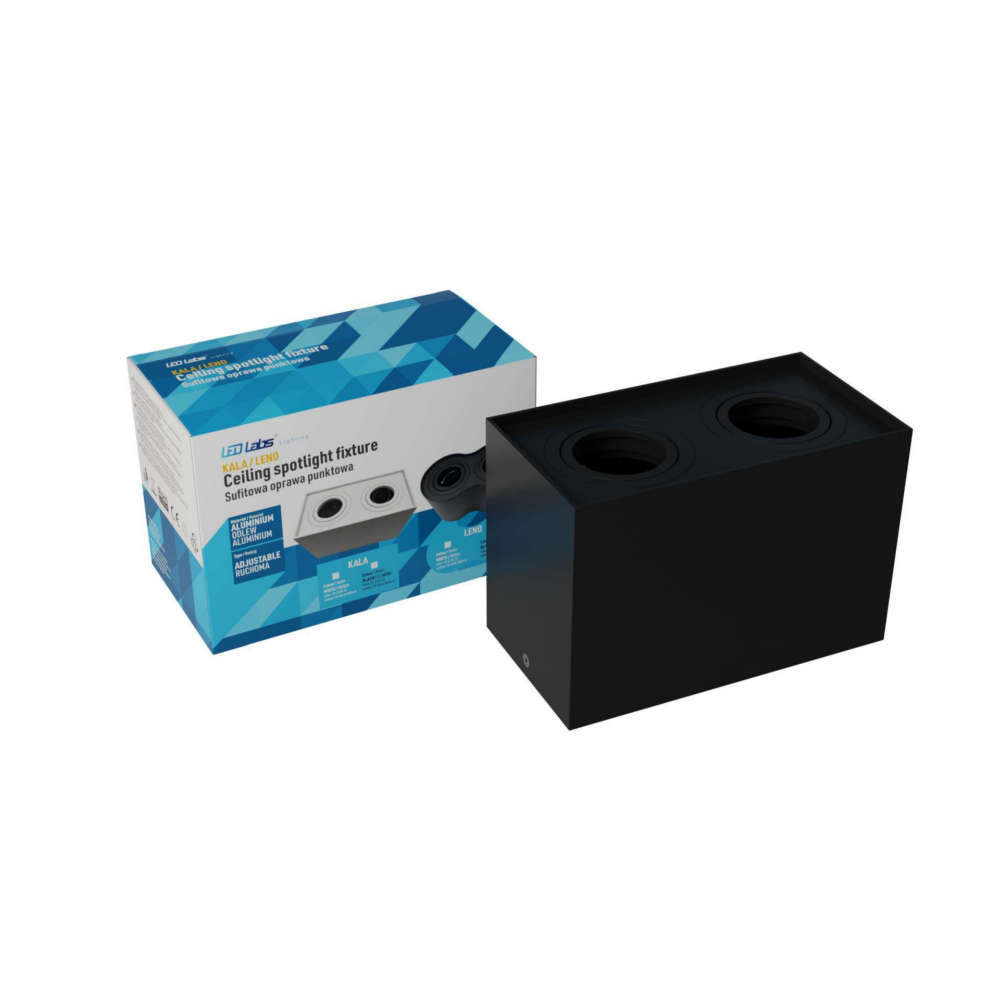 Двойна луна за външен монтаж Led Labs Kala 20-2220-25 - осветително тяло за монтажа на таван с фасунги GU10 подходящо за основно или акцентно осветление в дома или офиса. Изработено от алуминиева сплав, прахово боядисано в цвят черен мат. Вградените в корпуса 2 броя фасунги GU10 са адаптивни към всики LED лунички GU10. Подмяната на светлоизточника е бързо и лесно без необходимост от демонтаж на осветителното тяло.