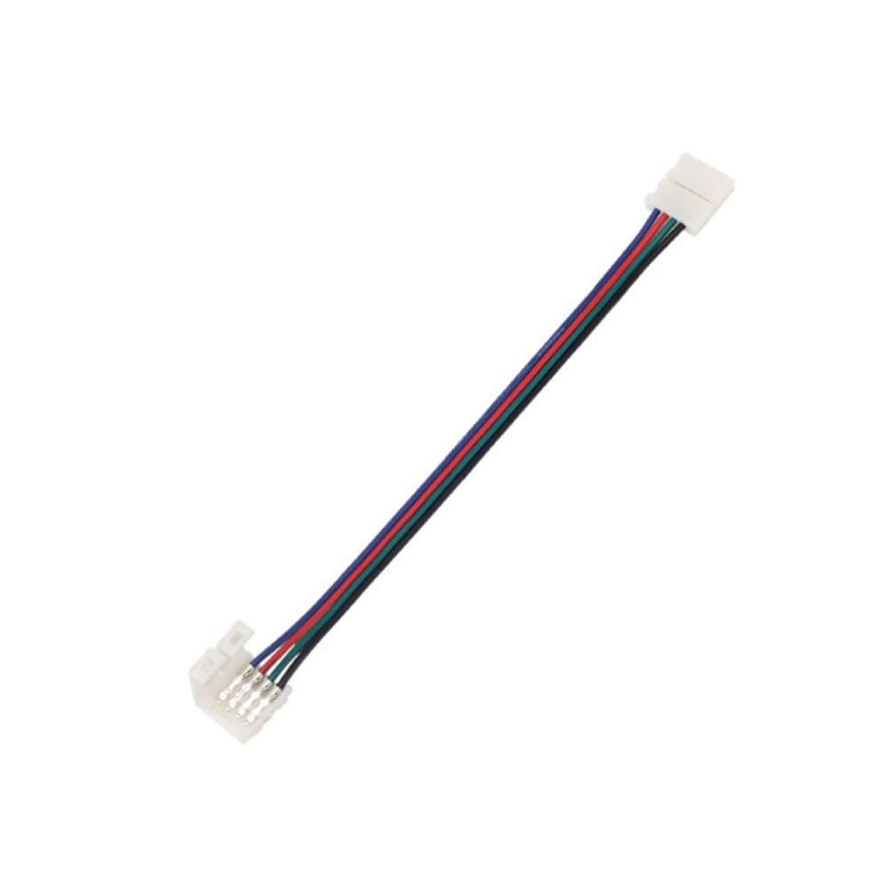 Двустранен конектор с гъвкав кабел за RGB LED лента 10мм LVT-3421. Конекторът е с четири пина, с размери 170x14x5 мм и улеснява удължаването на цветни LED ленти без необходимост от запояване.