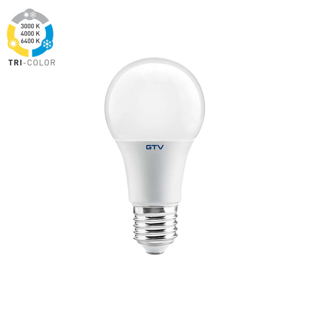 E27 led крушка с три цвята GTV LD-3SCTA60-10W - led лампа с цокъл е27 променяща цветната си температура при всяко включване. Крушка тип А60 с мощност 10W с еквивалентен светлинен поток от 840lm на лампа от 62W. Трицветната крушка GTV LD-3SCTA60-10W работи по следния начин - при първо включване светва в топла 3000К светлина. При изключване и повторно включване светва в неутрална светлина. При трето включване светва с 6400К студена светлина.