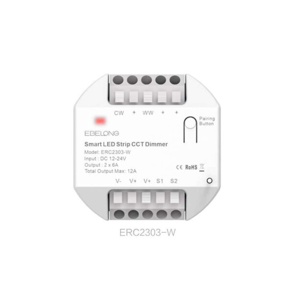 Ebelong ERC2303-W е иновативен двуканален CCT контролер, предназначен за управление на двуцветни CCT LED ленти. Съчетавайки WiFi и RF 433MHz комуникация, този компактен димер позволява безжично управление чрез мобилно приложение, гласови асистенти (Google Assistant, Amazon Alexa) и съвместими двуканални кинетични ключове Ebelong, серия S2. С възможност за димиране и регулиране на цветната температура, ERC2303-W осигурява гъвкавост и комфорт във всяко осветително решение. Компактните му размери (52x52x23 мм) позволяват лесен монтаж в конзолни кутии, отвори в ниши или тавани, като същевременно предлага надеждна производителност и съвместимост с различни системи за умен дом.