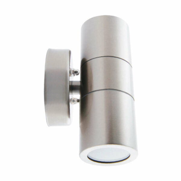 Фасадно осветително тяло - външно осветително тяло за стенен монтаж подходящо за градинско или фасадно осветление. Стилен осветител с метално тяло цвят никел и стъклен дифузер с инсталирани два броя фасунги GU10. Осветително тяло за фасада модел VEGAS -2A се продлага без светлинен източник.