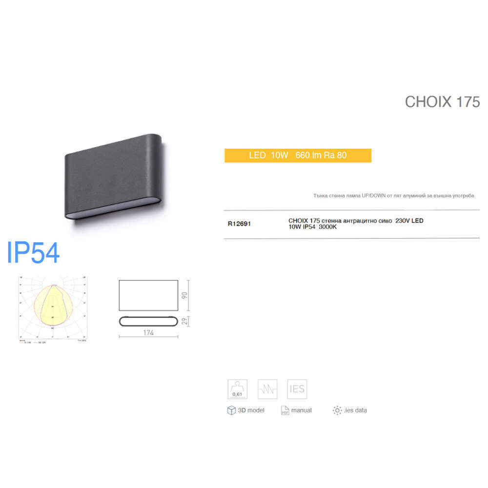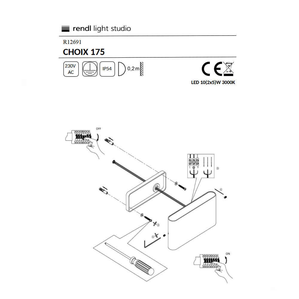 Фасадният LED аплик CHOIX 175 Rendl Light Studio R12691 комбинира модерен дизайн и енергийна ефективност. Тялото е с вградено LED осветление 2×25W, излъчващо топло бяла светлина 3000K. Изработен е от устойчиви материали, подходящ за външен монтаж и осигурява насочено осветление за акцент.