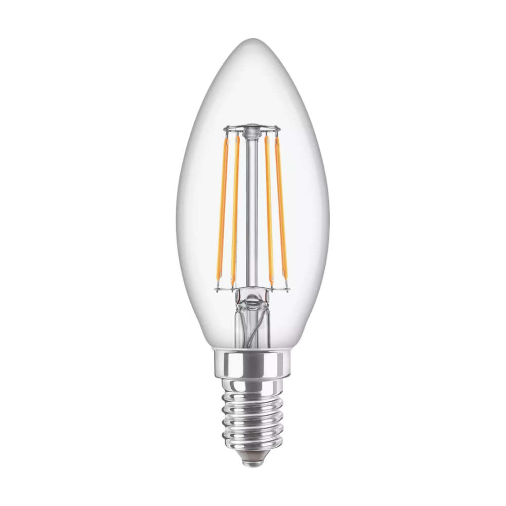 Филамент LED крушката Philips E14 4.3W предлага топла бяла светлина, класически дизайн тип свещ (B35) и енергийно ефективна алтернатива на традиционните 40W лампи.