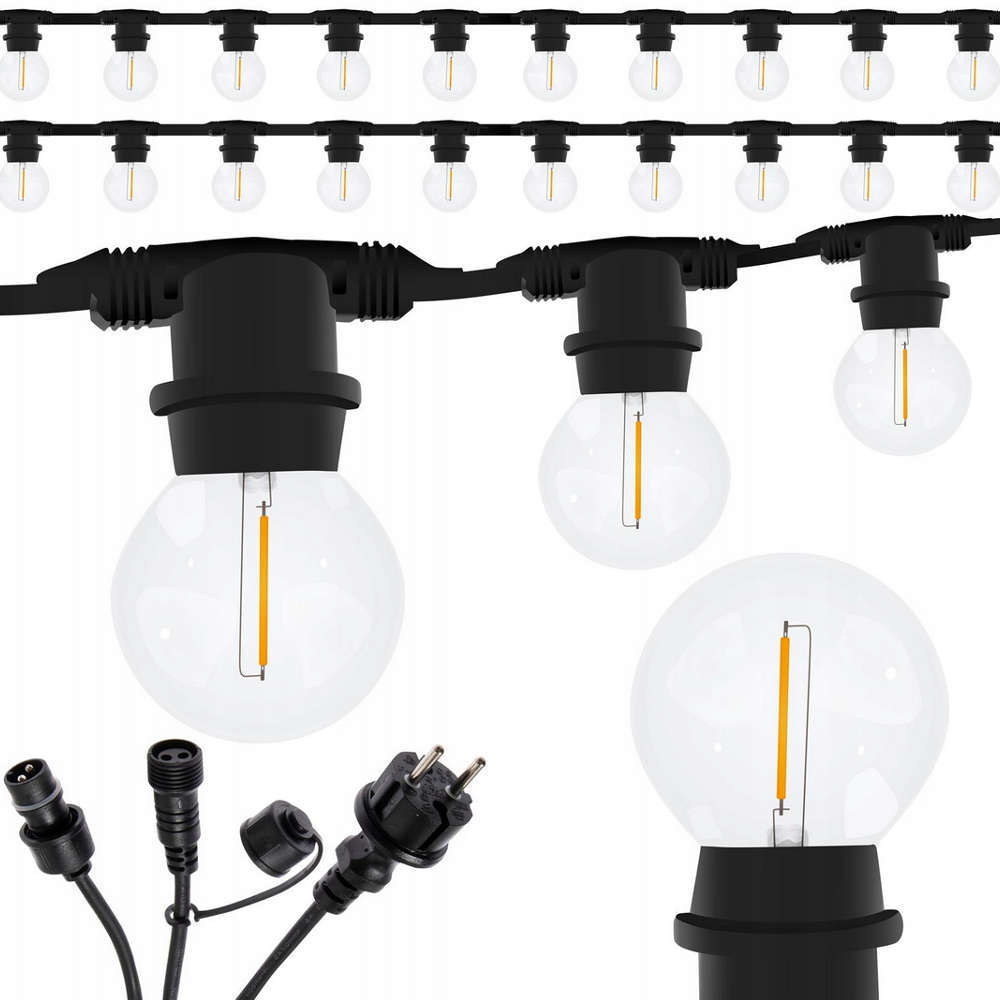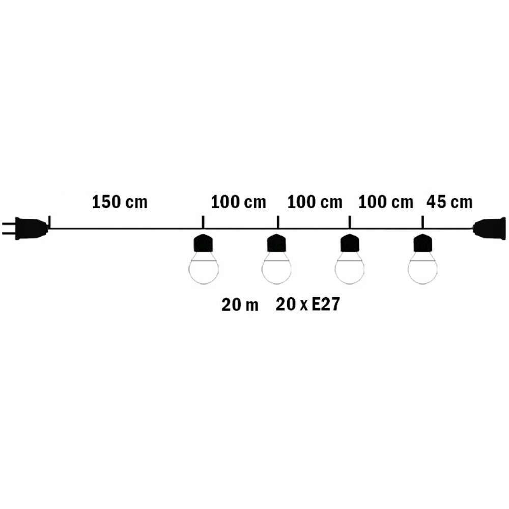 Гирлянд Е27 LVT 2544 - 20 метрова верига с херметични конектори на фасунги Е27 за външно приложение. Гирляндът заедно с двадесет декоративни LED крушки (закупуват се отделно) с резба E27 представляват цялостен и издръжлив светлинен източник. Комплектът изглежда красиво в градината, може да бъде и основен източник на светлина за вашата беседка, тераса, барбекю, заведение. Подходящото разпределение на светлините ще създаде необичайна атмосфера и в същото време ще бъде идеален за вечерни събития на открито. Материалите, използвани за направата на гирлянда, осигуряват устойчивост на прах и влага, която е IP44. Всяка фасунга за гирлянди е снабдено със солидно уплътнение. Предимството на Е27 светещ гирлянд е възможността за удължаване с още дължини, благодарение на херметичния конектор в краищата на всеки гирлянд.