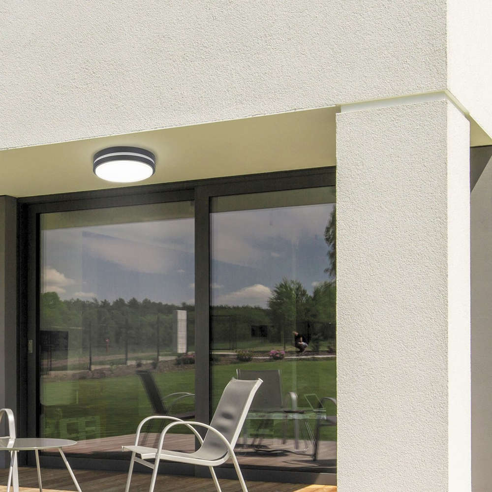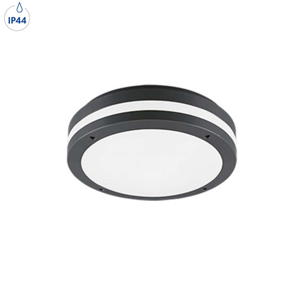 Влагоустойчив плафон IP44 - модерно кръгло осветително тяло за монтаж на таван или стена. Изработен от алуминий и UV поликарбонатен разсейвател плафонът е подходящ за осветяване на тераси, фасади, веранди, беседки. Тялото е с интегрирани две фасунги Е27, подходящо за използване на led лампи.