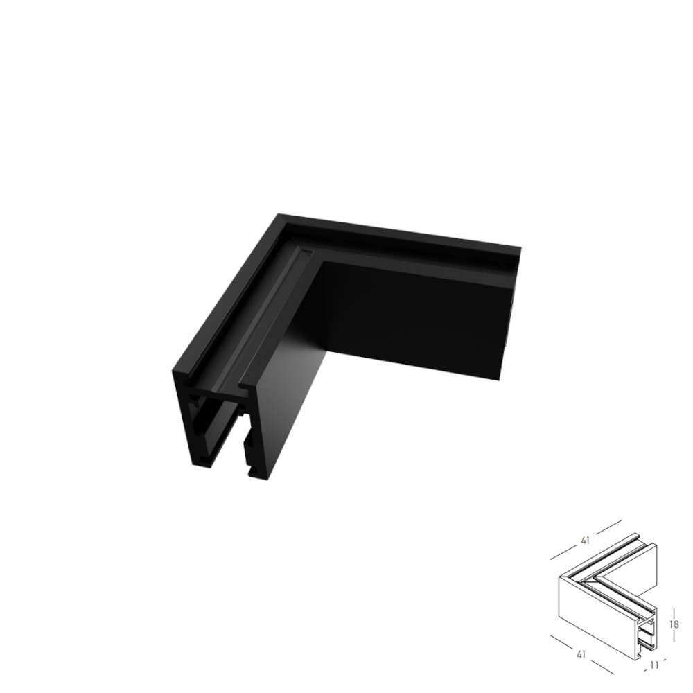 Хоризонтален ъгъл за магнитни шини Zambelis 2511 в черен мат, предназначен за изграждане на ултратънки магнитни осветителни системи 5 mm. Позволява естетично и прецизно свързване на релсите в хоризонтална конфигурация. Подходящ за повърхностен и окачен монтаж. Напълно съвместим с магнитни релси и аксесоари Zambelis SURFACE MAGNETIC TRACK 5MM, идеален за модерни интериорни решения.