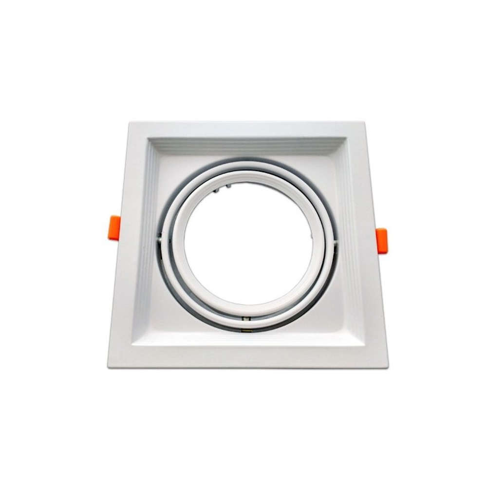 Квадратни луни за вграждане кардан - осветително тяло за вграждане използващо за светлинен източник лампа AR111. Карданна луна за лампа AR111 с ротация на тялото 25° спомагащо за прецизно насочване на светлината с приложения за акценто и основно осветление в магазини, търговски обекти, банкови учреждения, безиностанции. Луната е съвместима с всички модели лампи AR111.