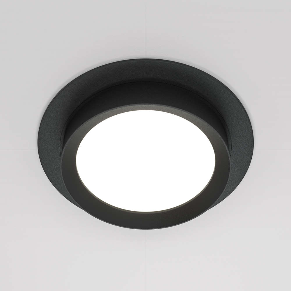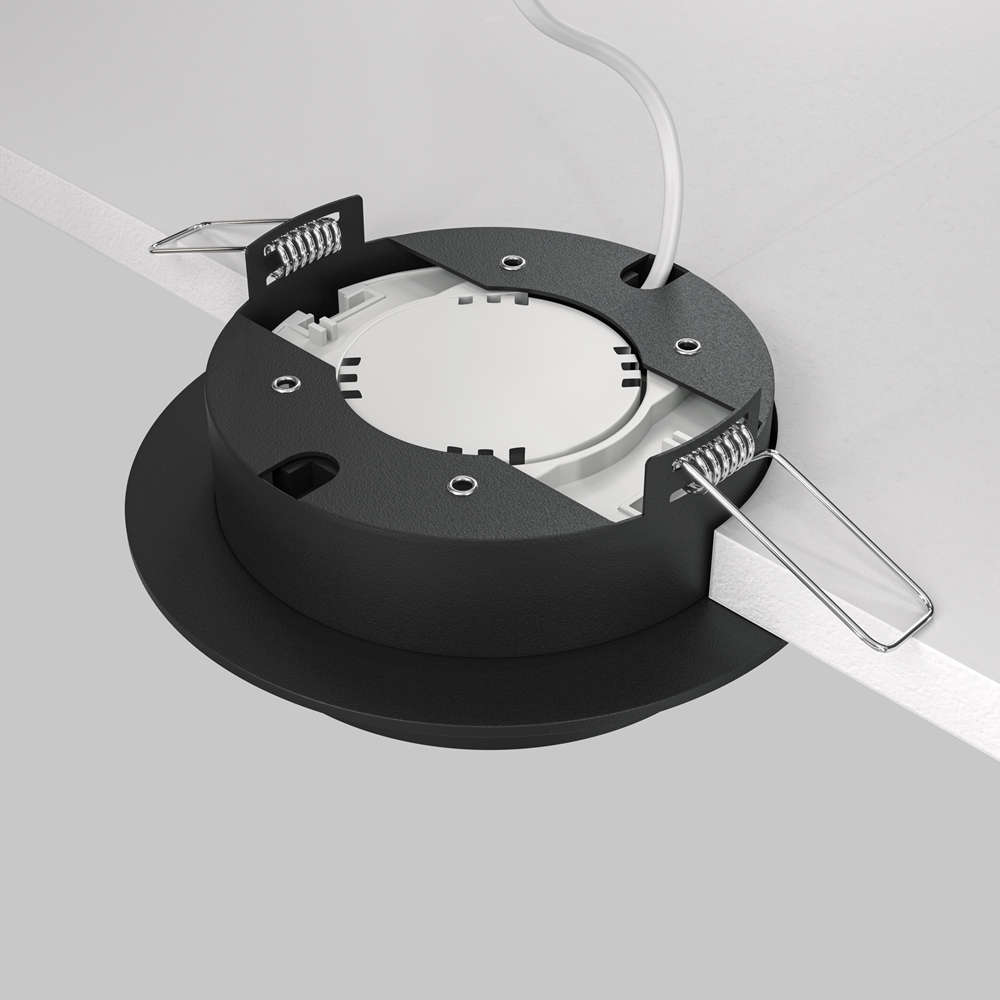 Луничка за вграждане в окачен таван Maytoni Hoop DL086-GX53-RD-BW с една фасунга GX53, черно алуминиево тяло с бял дифузер. Видимата кръгла рамка остава почти на нивото на тавана, а под нея слиза 15 мм пръстен с дифузер, който оформя светлината и създава характерния мек светлинен ефект на серията Hoop.