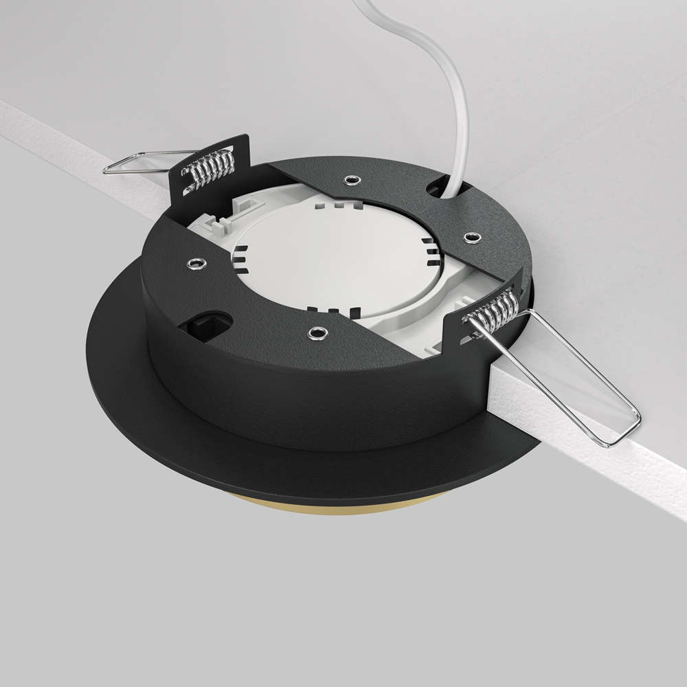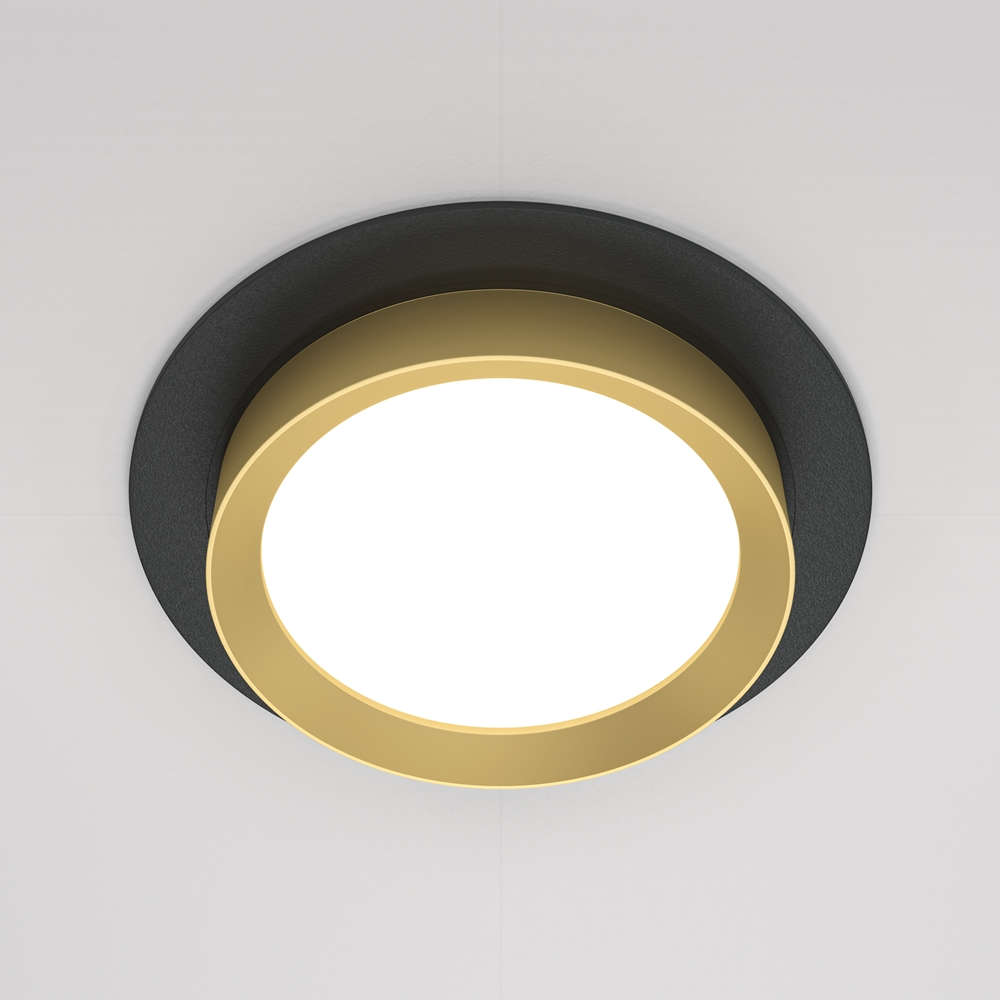 Луничка за вграждане в окачен таван Maytoni Hoop DL086-GX53-RD-BG с една фасунга GX53, черно алуминиево тяло с матов златен пръстен и бял дифузер.