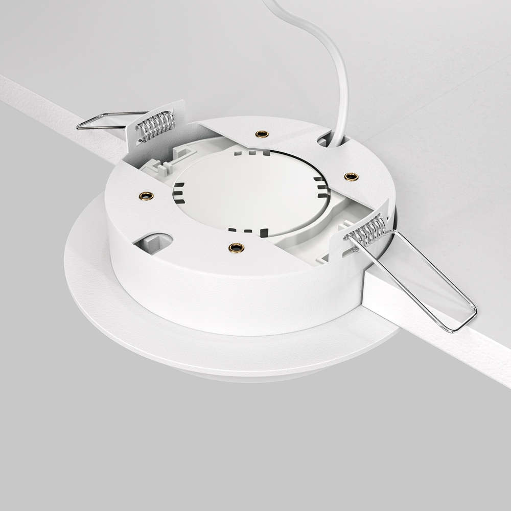 Луничка за вграждане в окачен таван Maytoni Hoop DL086-GX53-RD-W с една фасунга GX53, бяло алуминиево тяло с елегантен бял дифузер. Видимата кръгла рамка остава почти на нивото на тавана, а под нея слиза 15 мм пръстен с дифузер, който оформя светлината и създава характерния мек светлинен ефект на серията Hoop.