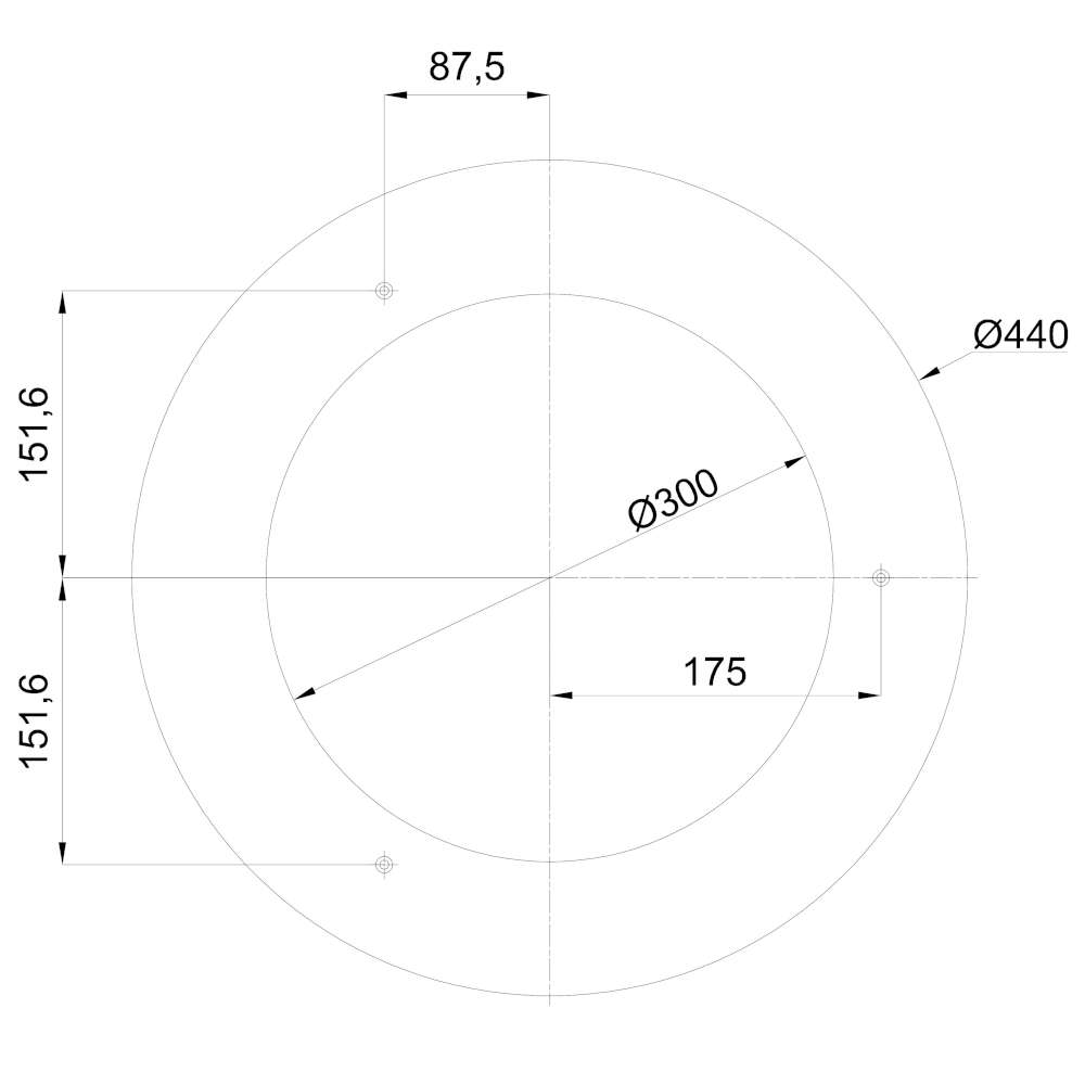 Осветителното тяло е оборудвано с кръгъл дифузер с диаметър Ø440 mm, изработен от опалов поликарбонат. Този материал осигурява равномерно разпределение на светлината, висока устойчивост на удар и дълъг експлоатационен живот. Конструкцията гарантира и лесна поддръжка благодарение на стабилната система за фиксиране.