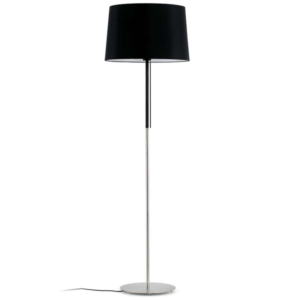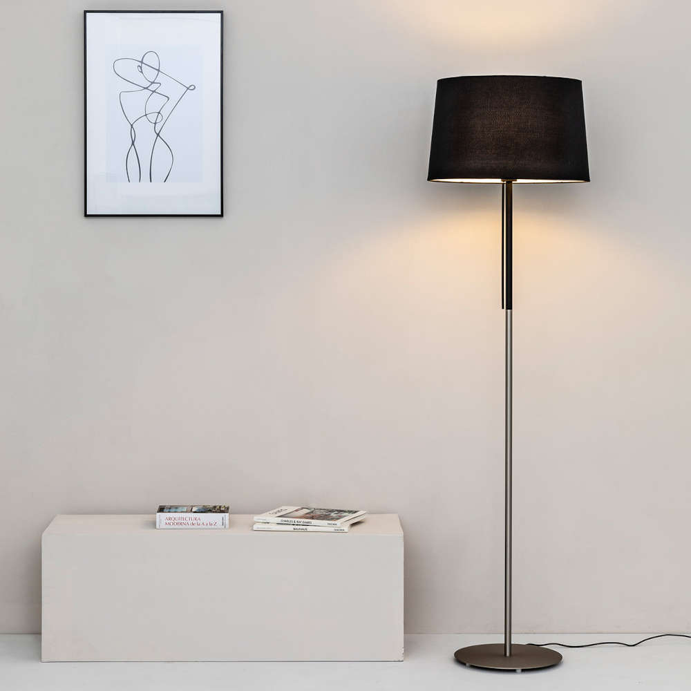 Лампион FARO BARCELONA VOLTA Black 20030 - стилен дизайнерски модел с черен текстилен абажур и метална конструкция в матово черно със сатениран никел. Осигурява мека, уютна светлина, идеален за спалня, хол и кът за четене.