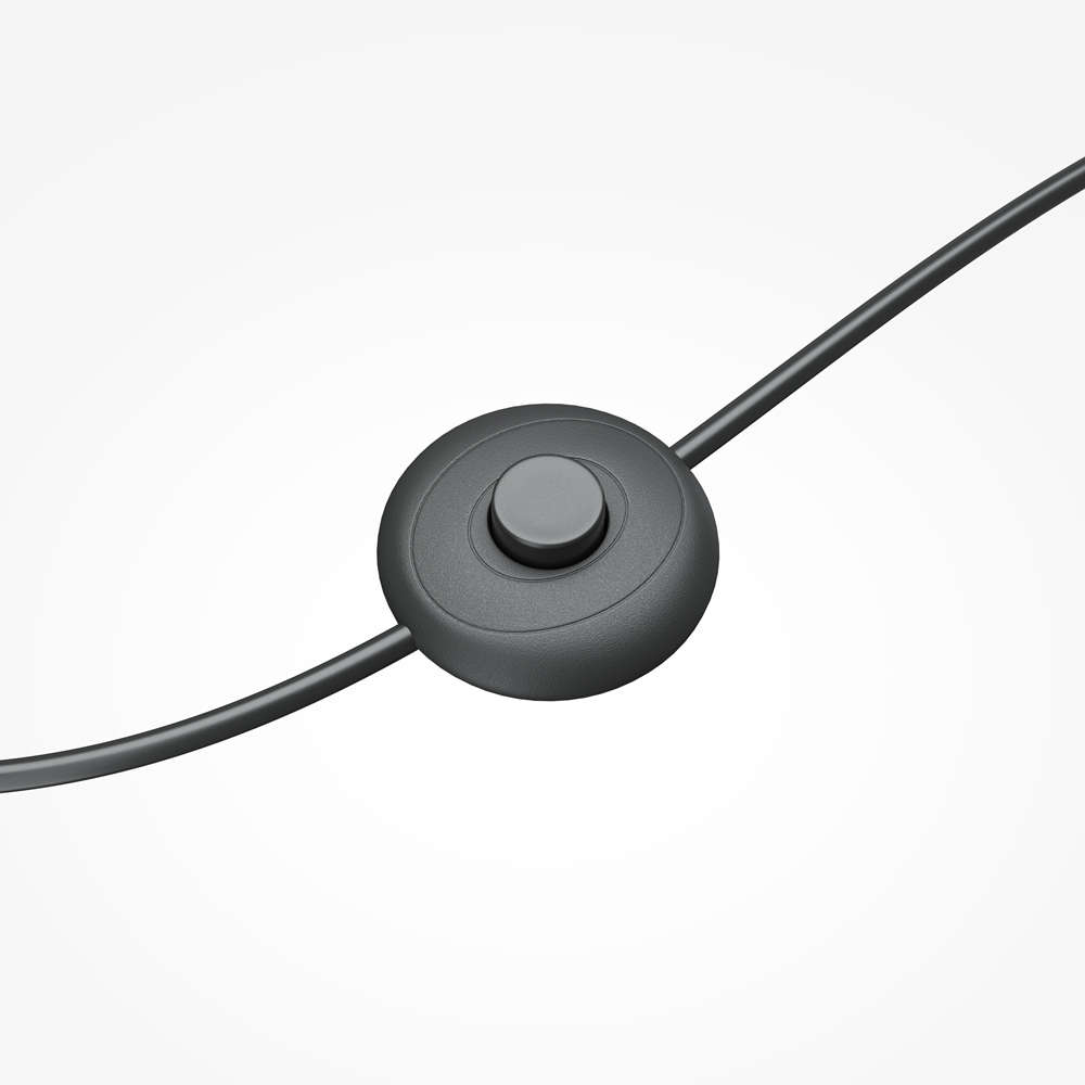 Конструкцията на лампиона е изпълнена в черен метал с гланцово покритие, а всички монтажни и технически елементи са дискретно скрити, за да не нарушават чистата геометрия на дизайна. Димирането се управлява чрез бутон, разположен на захранващия кабел, което позволява лесно регулиране на яркостта според атмосферата и нуждите на пространството.