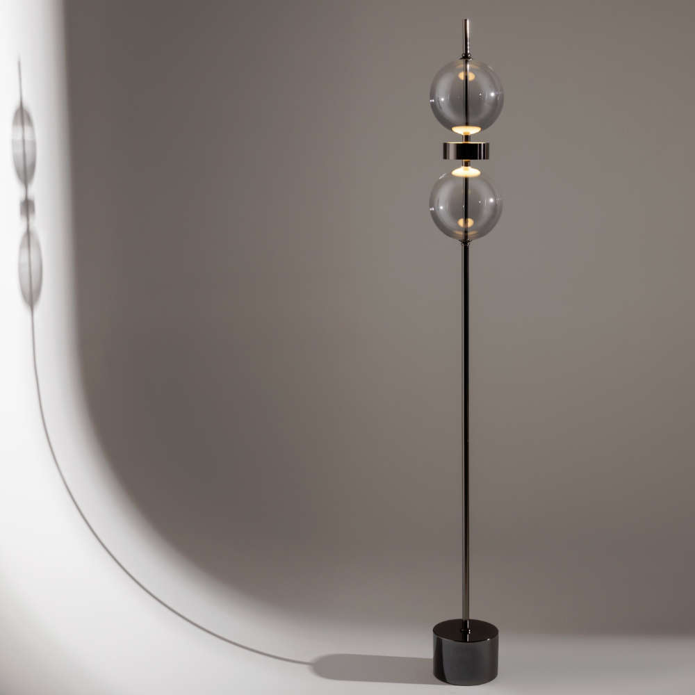Между сферите е разположен централен кръг с двустранен акрилен разсейвател, който насочва светлината едновременно нагоре и надолу. По този начин LED източникът с топла светлина 3000K нежно осветява стъклените елементи и създава ефект на вътрешно сияние, характерен за серията Double Moon.