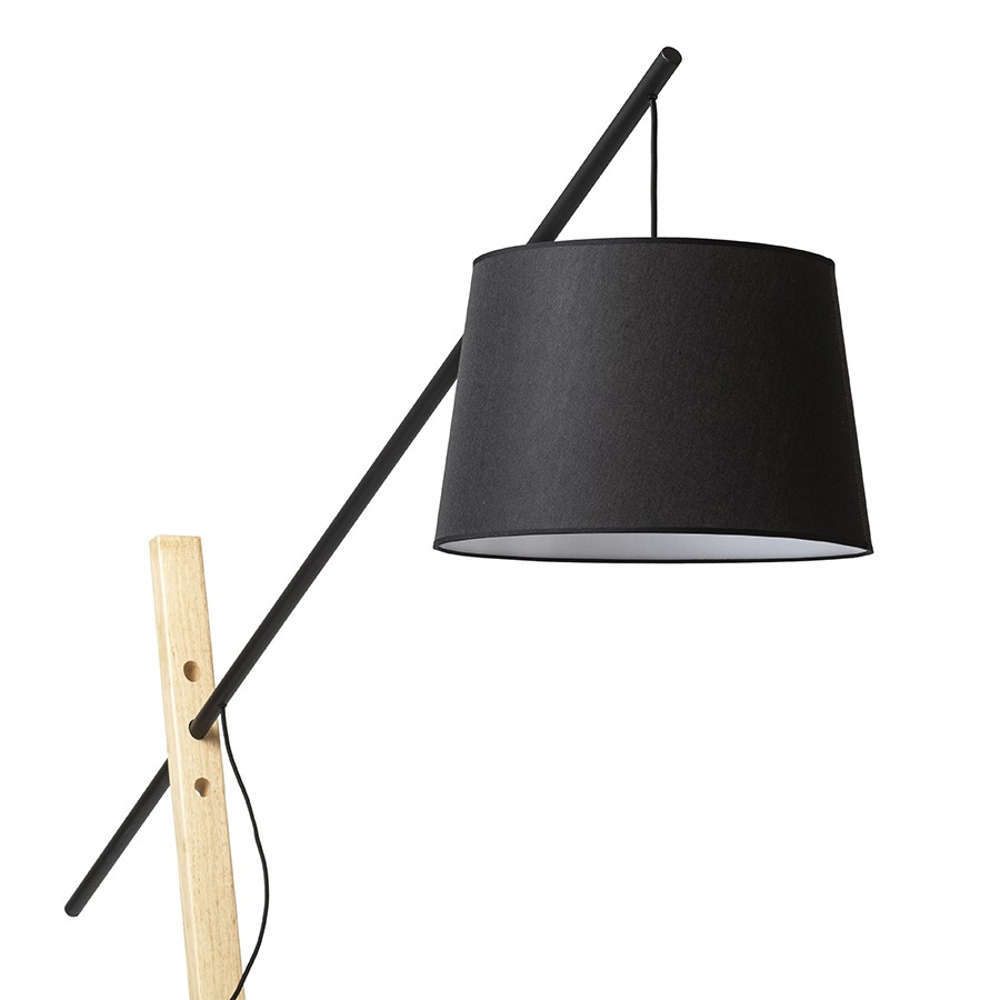 Massive decorative floor lamp for combination of wood and metal, whereas the shade is textile