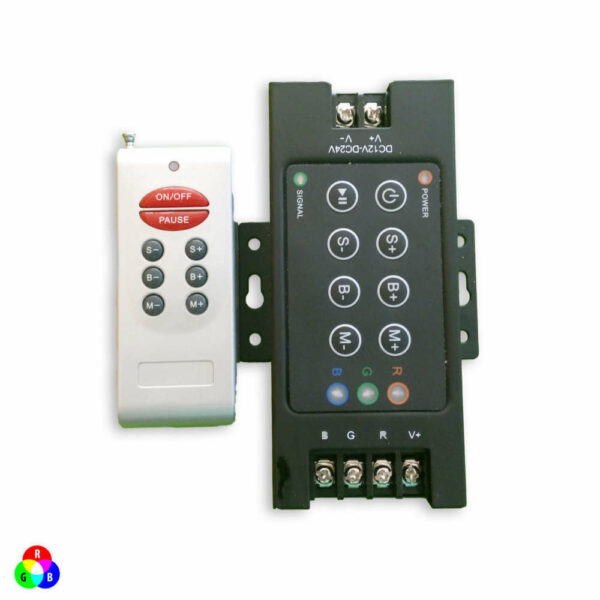 RGB контролер с радио управление LIM-699. RF управляем контролер с дистанционно за команди на RGB LED ленти с обща мощност до 360W при 12V и 720W при 24V. Дистанционно управление с обхват max. до 30м и 8 бутона за пускане, спиране, димиране интензитета на светлината, с функции за смяна или преливане на цветовете.