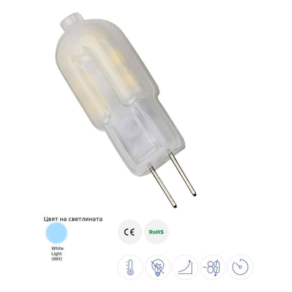 LED крушка Optonica 1615 с цокъл G4 и консумация 2W, работеща на 12V AC/DC. LED крушката е с ъгъл на светене 360°, излъчваща светлинен поток 170LM студена светлина.