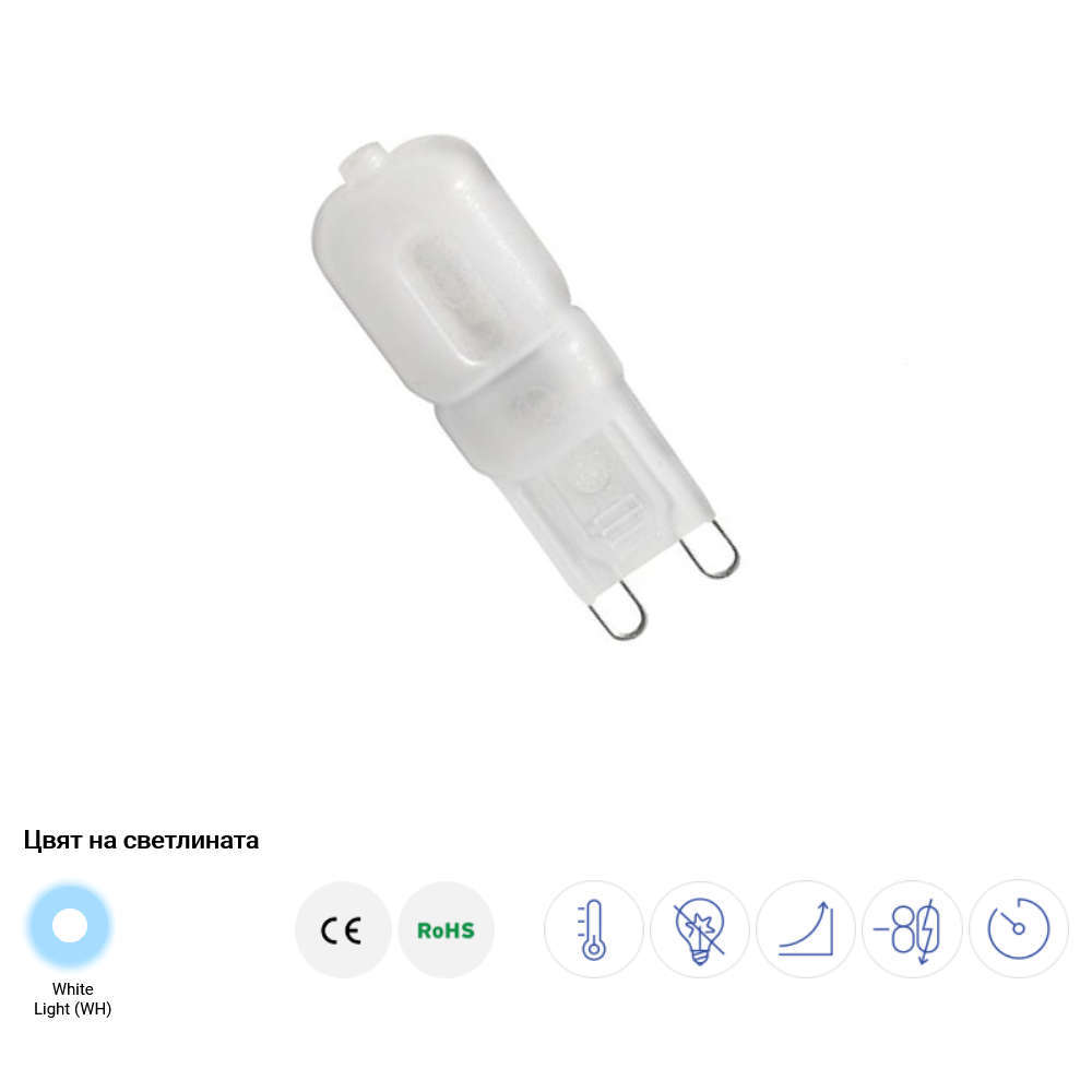 LED крушки Optonica SP1638 с цокъл G9, мощност 3W, захранване 170-265V AC, студена светлина 6000K и ъгъл на излъчване на светлината от 360°. LED крушката е икономична, надеждна, дълготрайна и с много добро качество, като може да замести класическите крушки с цокъл G9 с мощност 23W.