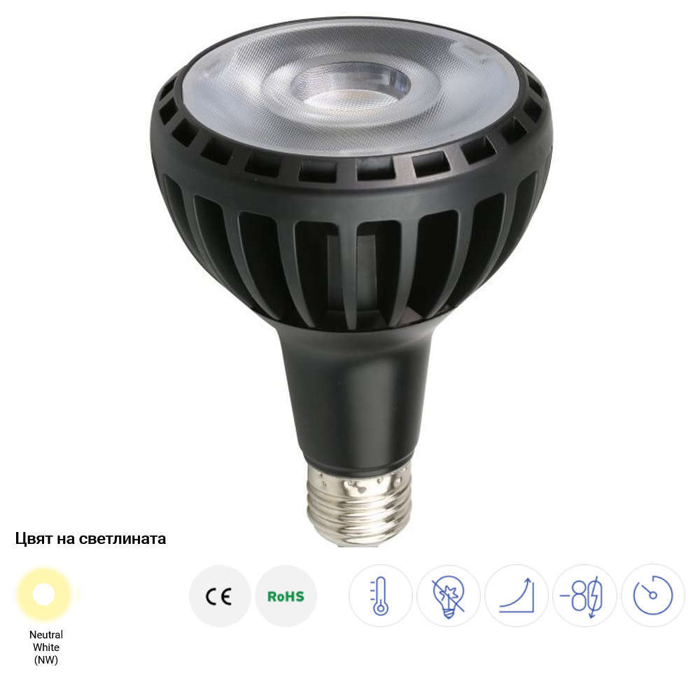 PAR LED крушка в черен цвят Optonica 1529, излъчваща неутрална 4500К светлина с насоченост от 30°. С цокъл Е27 крушката е подходяща за инсталиране във всички стандартни осветителни тела с фасунги Е27. Светодиодната LED PAR крушка Optonica 1529 е висококачествен продукт, подходящ за бизнес, офис и търговско осветление, който гарантира икономично и надеждно LED осветление с живот от 25000 часа и 24 месеца гаранция.