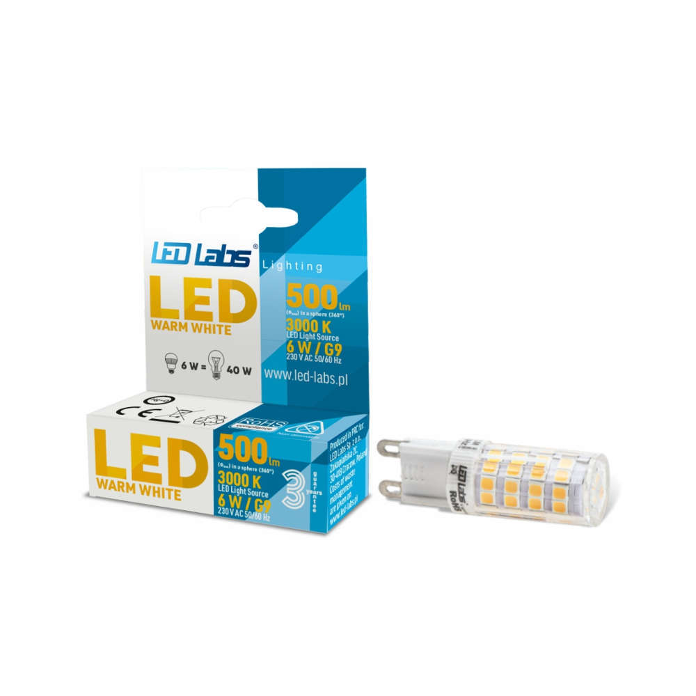 LED лампа G9 Led Labs 21-3111-15 - нов модел кушка G9, намираща множество приложения, където се използват G9 Bi-Pin крушки, като стенни тела, осветителни тела за стъпала, висящи пендели, декоративни лампи, настолни лампи или външни тела с корпуси, устойчиви на атмосферни влияния. Използвайки мощни светодиоди SMD, затворени в прозрачна, устойчива на разбиване обвивка, крушката излъчва 500 лумена топло бяло осветление. G9 Bi-Pin основа и позволява лесен монтаж във фасунги G9. Енергийно ефективната LED крушка използва само 6 вата мощност - сравнима със халогенна такава, която би консумирала 40 вата. Тази крушка работи с 220 VAC и е проектирана да издържа 25 пъти по-дълго от крушките с нажежаема жичка.