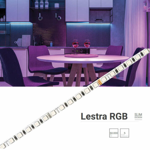 LED лента BERGMEN Lestra RGB 24VDC 9.6 W 5mm 120x3838SMD IP20 2.5м ролка. BERGMEN Lestra RGB е LED лента с ширина само 5 мм, която позволява да се получат всякакви цветове в диапазона на видимата светлина. Продуктът се препоръчва за използване в тесни мебелни форми и алуминиеви профили. Висококачествените светодиоди 120 броя 3838 SMD, осигуряват интензивни плътни цветове с мека светлина и ъгъл на светене 120°. RGB LED лентата е подходяща както за дома, така и за професионална употреба в декоративното и рекламно осветление.