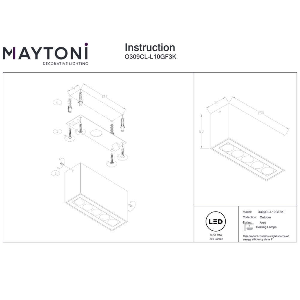 LED луна за външен монтаж Maytoni Ares O309CL-L10GF3K е висококачествен продукт изработен от метал и е защитен от прах и пръски вода (поради което е подходящ за употреба на открито). Работи с топли светодиоди с висока светлинна мощност и дълъг живот. Общата мощност е 10W, еквивалент на осветително тяло от 55W. Външната лампа има предварително поставено защитно стъкло за предотвратяване на преждевременно замърсяване на рефлектора. Повърхността е анодизирана и се предлага в цвят на корпуса графит. LED луна за външен монтаж Maytoni Ares O309CL-L10GF3K е подходяща за бани, мокри помещения, вътрешни и външни площи.