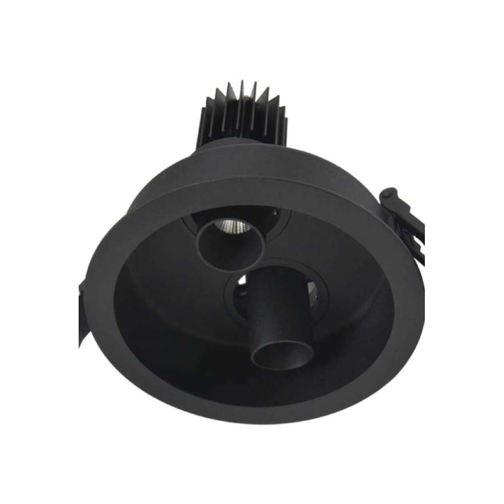 LED луничка за вграждане Zambelis 1926 с двоен насочваем спот е подходяща за акцентно осветление в хотели, офиси и заведения. С два LED източника по 9W, светлинен поток 2×810 lm и топла светлина 3000K, тя осигурява прецизно осветяване с ъгъл 18°. Работи на 220V с вграден драйвър и ON/OFF управление.