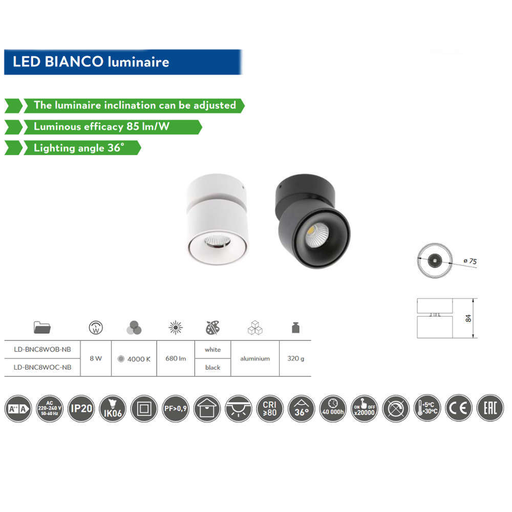 LED луна за външен монтаж GTV LD-BNC8WOC-NB - модерна LED луна за таван серия Bianco на полския производител на осветителни тела GTV. Стилно LED осветително тяло излъчващо неутрална светлина с възможност за насочване. Подходяща за основно или спот осветление.