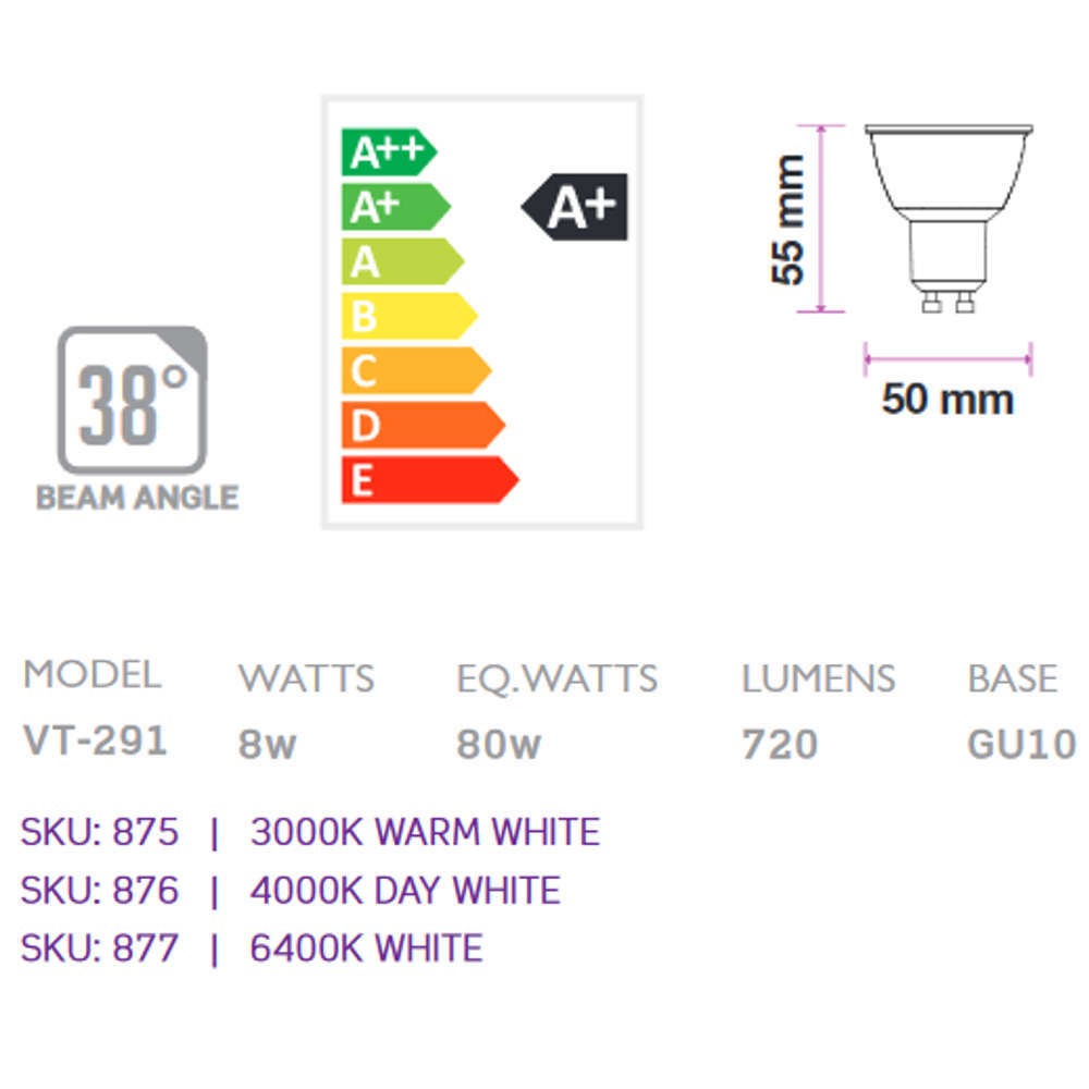 LED луничка с цокъл GU10 V-TAC 876 е мощна 8W LED крушка, модернизиран енергоефективен аналог на 80W халогенна MR16 крушка. Светодиодната луничка осигурява силно насочен 720lm светлинен поток на 38° и е идеален вариант за спотово осветление на обекти като картини или декорации. Цветът на излъчваната светлина е неутрална бяла, с 4000K цветна температура, подходяща за използване в домашни, офис и търговски помещения, в които имаме нужда от продуктивна работна светлина. LED луничката е с висок CRI>80 за точно пресъздаване на цветовете, висококачествен SAMSUNG чип и пет години гаранция като продукт от PRO-серията LED осветителни тела на V-TAC.