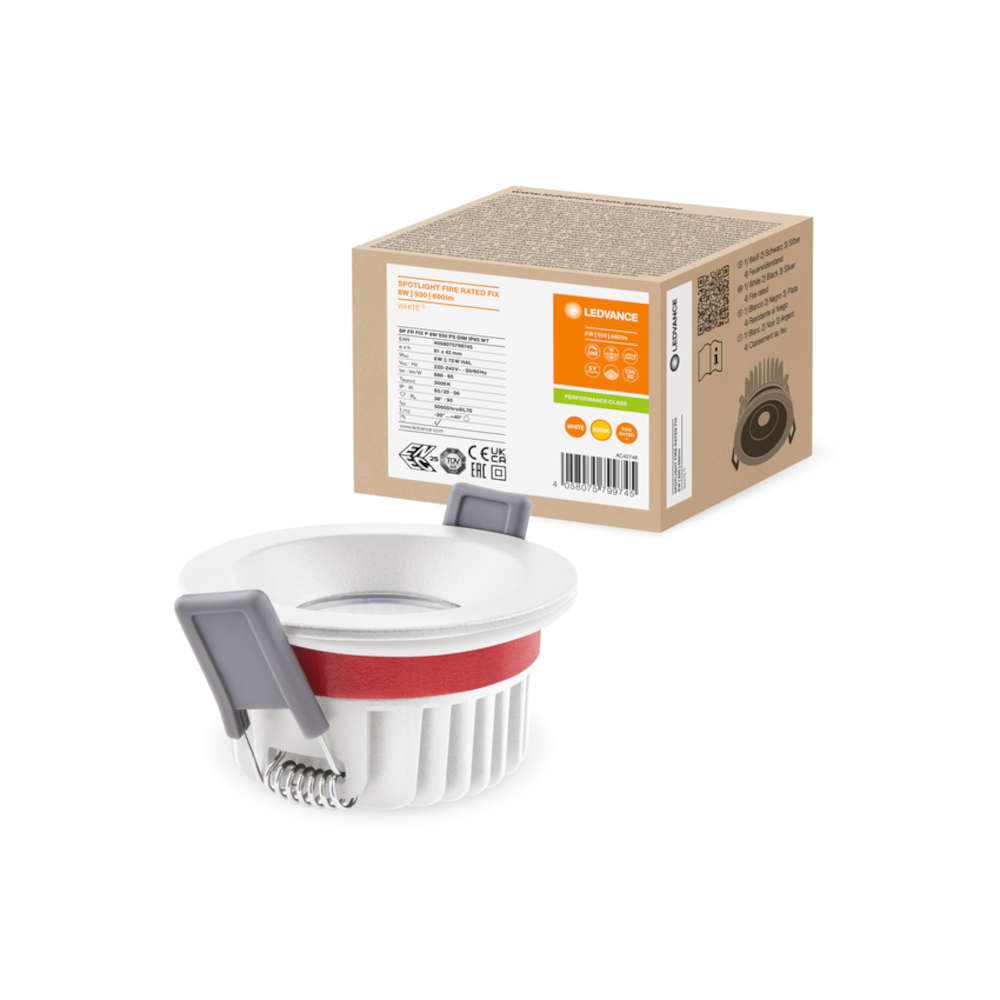 Професионална LED луничка за вграждане Ledvance 4058075799745 с мощност 8W, топла светлина 3000K и 680 lm. IP65 защита от страната на помещението, димируема функция и висок индекс на цветопредаване Ra≥90. Подходяща за бани, пожароустойчиви тавани, хотели, ресторанти, коридори и влажни помещения. Директен заместител на халогенни спотове, с лят алуминиев корпус и 5 години гаранция.