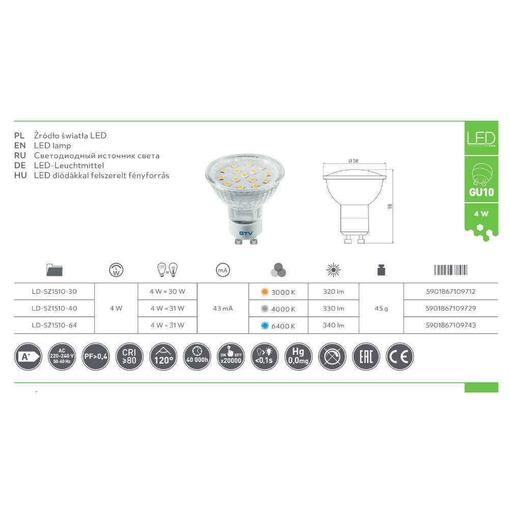 Led луничка 220V GTV LD-SZ1510-40 - стъклена луничка с цокъл GU10 светеща с максимален ъгъл от 120°. Стандартните размери на тялото позволяват монтаж във всички модели луни за вграждане или луни за външен монтаж. Качествена 220V лучничка с chip SMD2835 излъчващ неутрална 4500К светлина подходяща за основно осветление.
