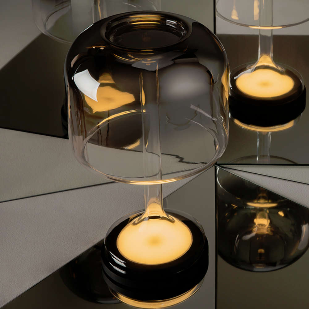 Стъклена настолна лампа с метална основа в черен цвят, стъклено рамо и опушен стъклен абажур, вграден LED 13W, 1600lm, 3000K, 220V, кабел с ключ, с димиране
