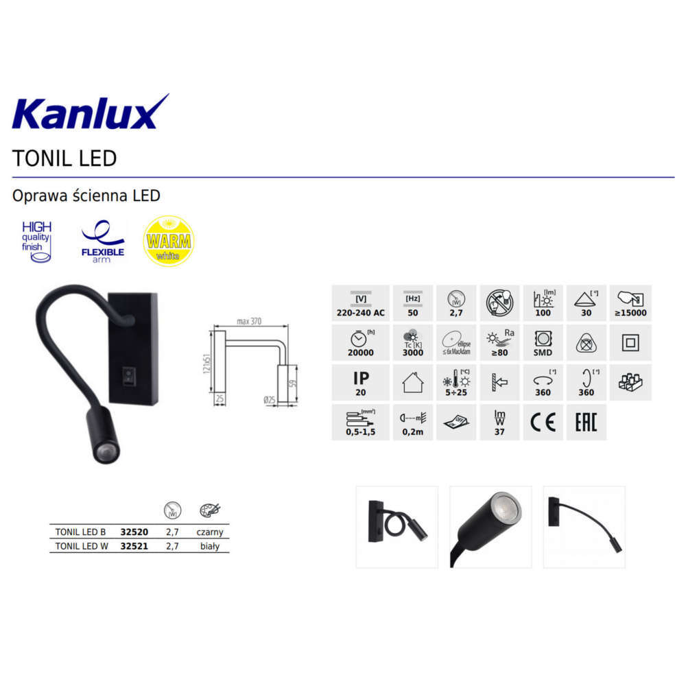 KANLUX TONIL II LED B 32522, led спот осветително тяло за стена с ключ, 220V, топла светлина, IP20, черно подвижно тяло 360°