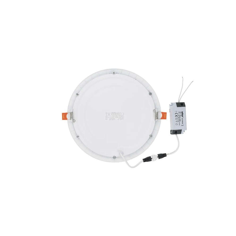 VITO LENA-RX 2023970 е кръгъл LED панел за вграждане в таван с мощност 18W, осигуряващ топла светлина 3000К и 1620lm светлинен поток. Осветителното тяло е тънко, изчистено и eлегантно с бялата си рамка и матиран дифузер, като се вписва идеално във всякакъв вид домашни, офис и търговски помещения. LED панелът е универсално и икономично решение за общо осветяване на кухня, хол, коридори, офиси, обществени сгради, заведения, хотели, ресторанти, бензиностанции. Светодиодният панел за вграждане се предлага окомплектован с драйвер и може да замени халогенна луна или осветително тяло с приблизителна мощност от 100W.